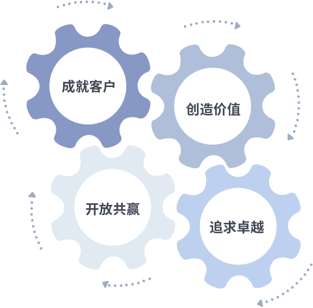 成就客户是一切决策的出发点,,,,创造价值是衡量所有工作的标准,,追求卓越是我们做事做人的态度,,,开放共赢是我们的格局也是最终的结果。。。价值观的齿轮环环相扣,,推动着组织里的每个人不断向前。。