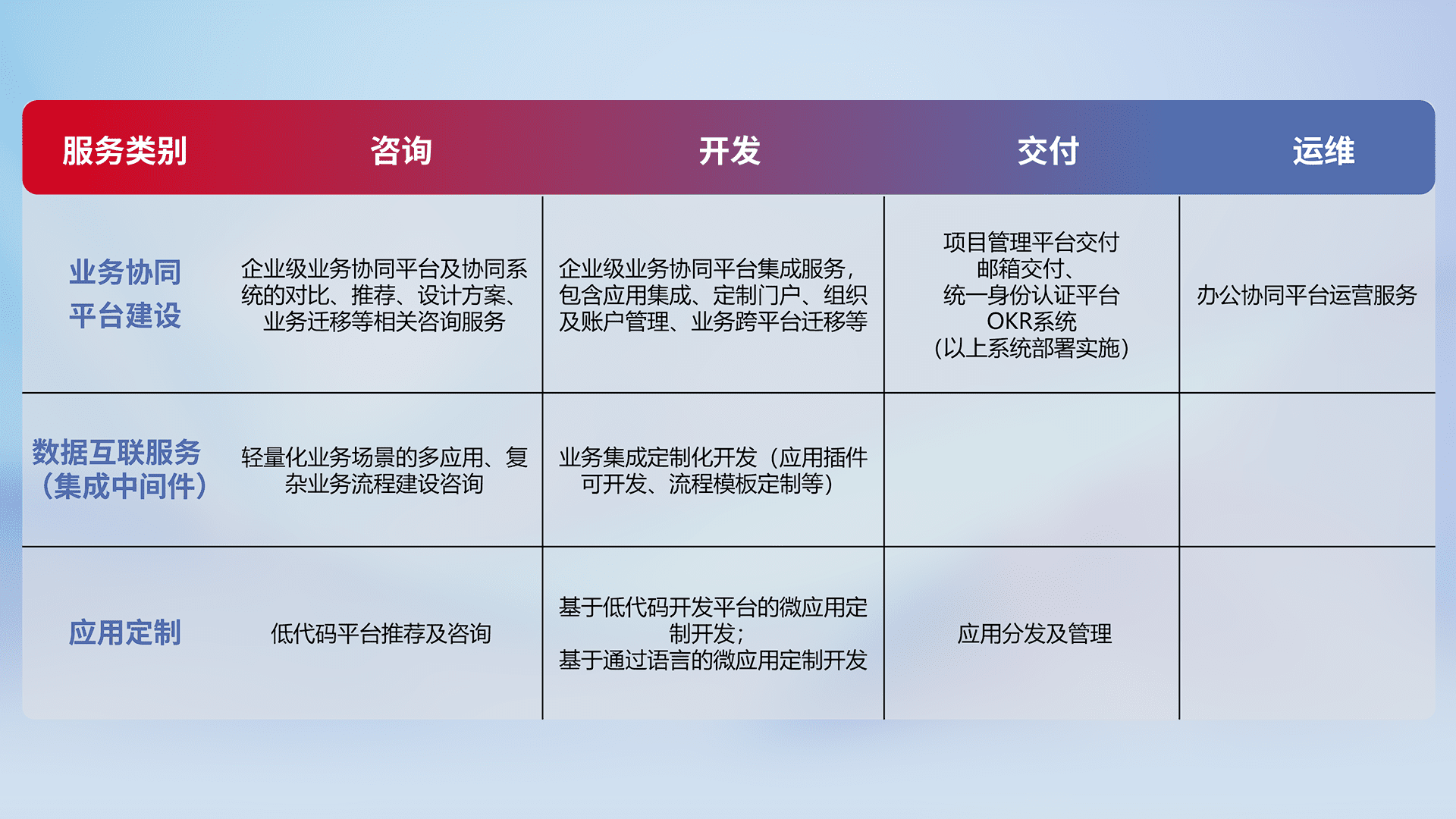 针对钉钉、、企微、、、、IDaas等平台级产品提供产品的规划、、、、方案、、、交付、、、、定制化开发等服务,,,,实现如统一协同办公、、、、智能客户服务、、、、混合会议管理、、智能数据查询、、等业务场景,,实现数字化转型。。